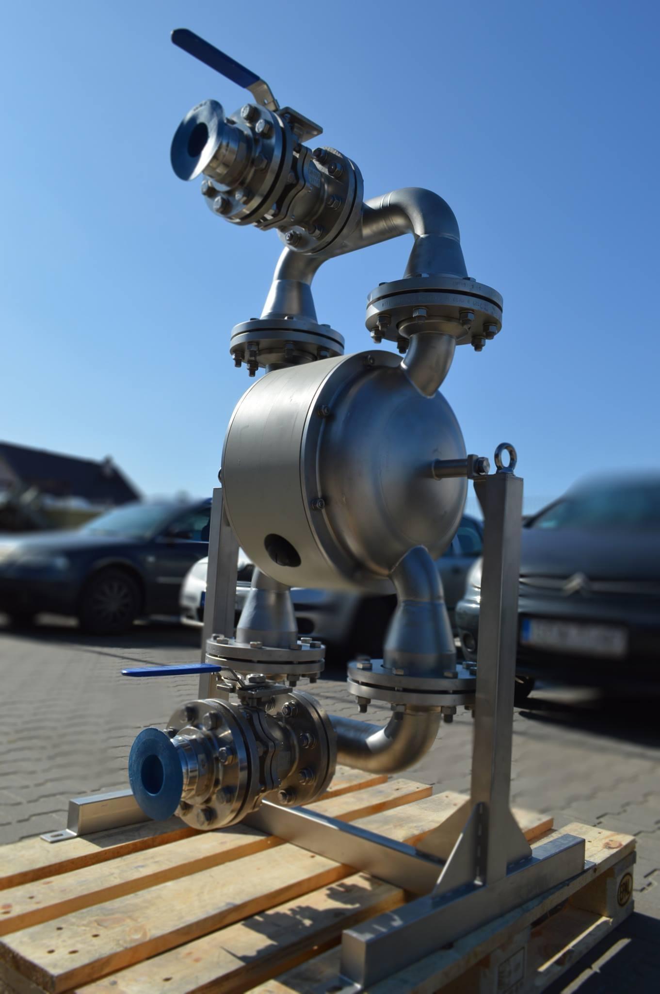 Tapflo T 820 S Membranpumpe mit Absperrventilen und Camlock-Anschlüssen zum Entladen von IBC-Tanks (Intermediate Bulk Container).