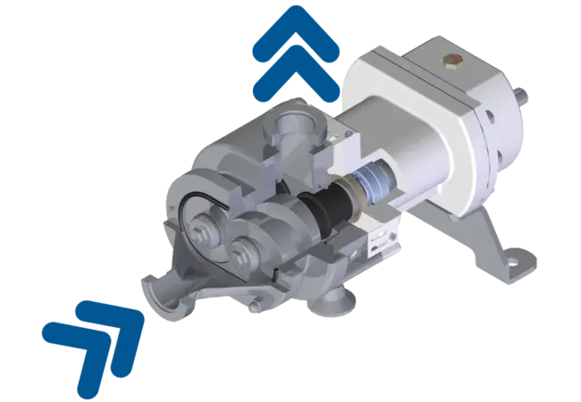 Das Funktionsprinzip von Doppelschneckenpumpen ist nicht kompliziert – im Herzen der Pumpe befinden sich **zwei rotierende schraubenförmige Rotoren**, die berührungslos zueinander und zum Pumpengehäuse arbeiten. Sie bewirken eine **lineare Verdrängung des Mediums im Pumpenkörper** von der Saugseite zur Druckseite – direkt zum Auslassstutzen.
