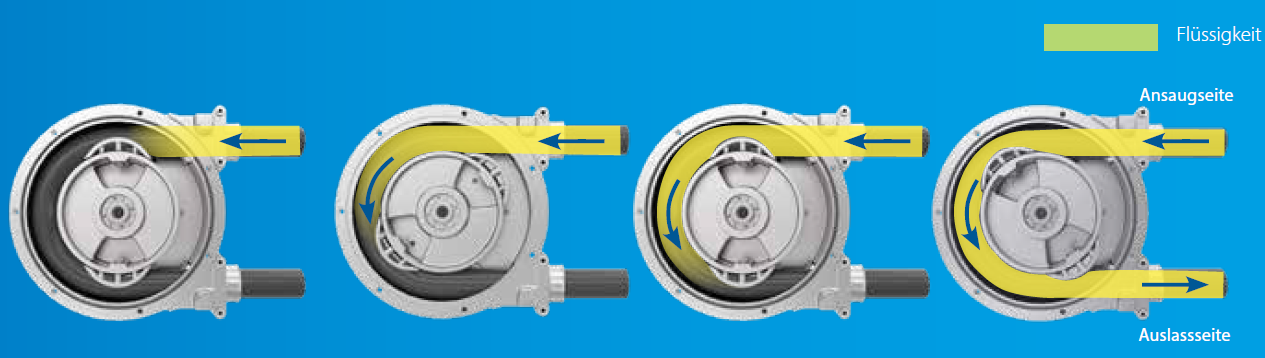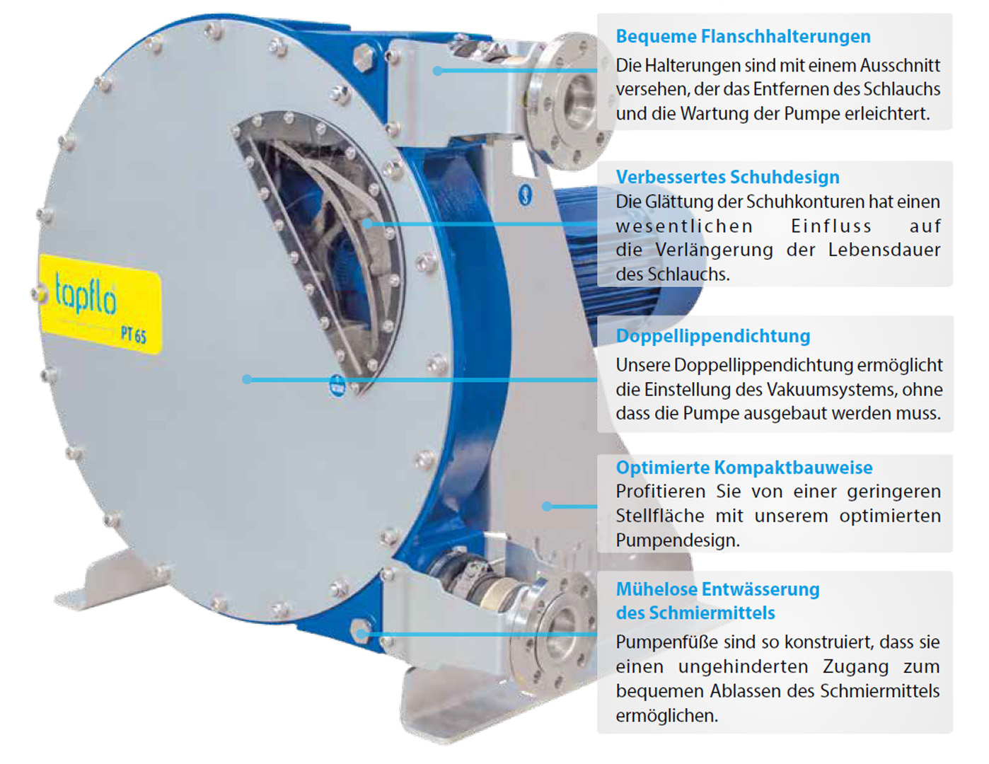 Die Tapflo-Schlauchpumpe wird von einem Getriebemotor angetrieben. Der Rotor ist direkt auf der Welle montiert. Er ist entweder mit Schuhen ausgestattet oder besitzt selbst eine spezielle Form. Die Schuhe komprimieren den Schlauch und erzeugen so auf der Saugseite der Pumpe ein Vakuum und auf der Druckseite einen Überdruck, um die Flüssigkeit zu fördern.