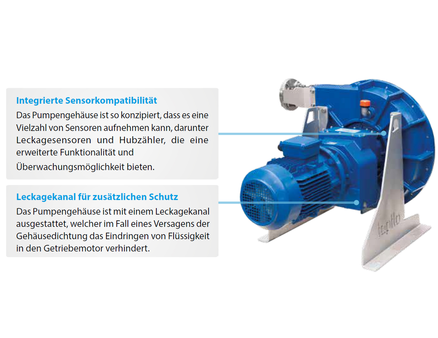 Diese Konstruktion ermöglicht es der Pumpe, mit einem höheren Förderdruck von bis zu 15 bar zu arbeiten, um Verstopfungen zu vermeiden und damit die Lebensdauer des Schlauches zu erhöhen.