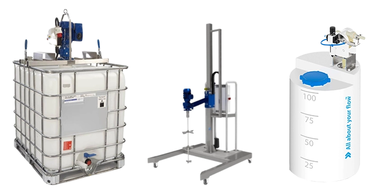 - IBC-Container-Mischer – einfaches und effektives Mischen von Produkten im IBC-Behälter. Sie ermöglichen das Mischen von Medien mit einer Viskosität von bis zu 20.000 mPa·s, wie z. B.: wasserbasierte oder lösungsmittelbasierte Farben, Klebstoffe, Pulver und viele andere.