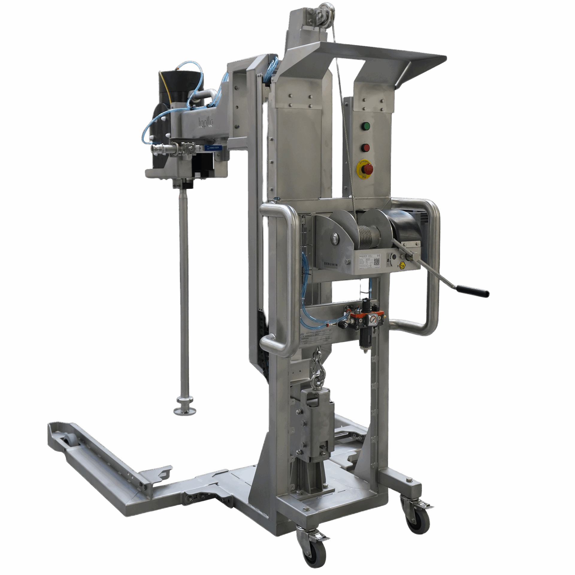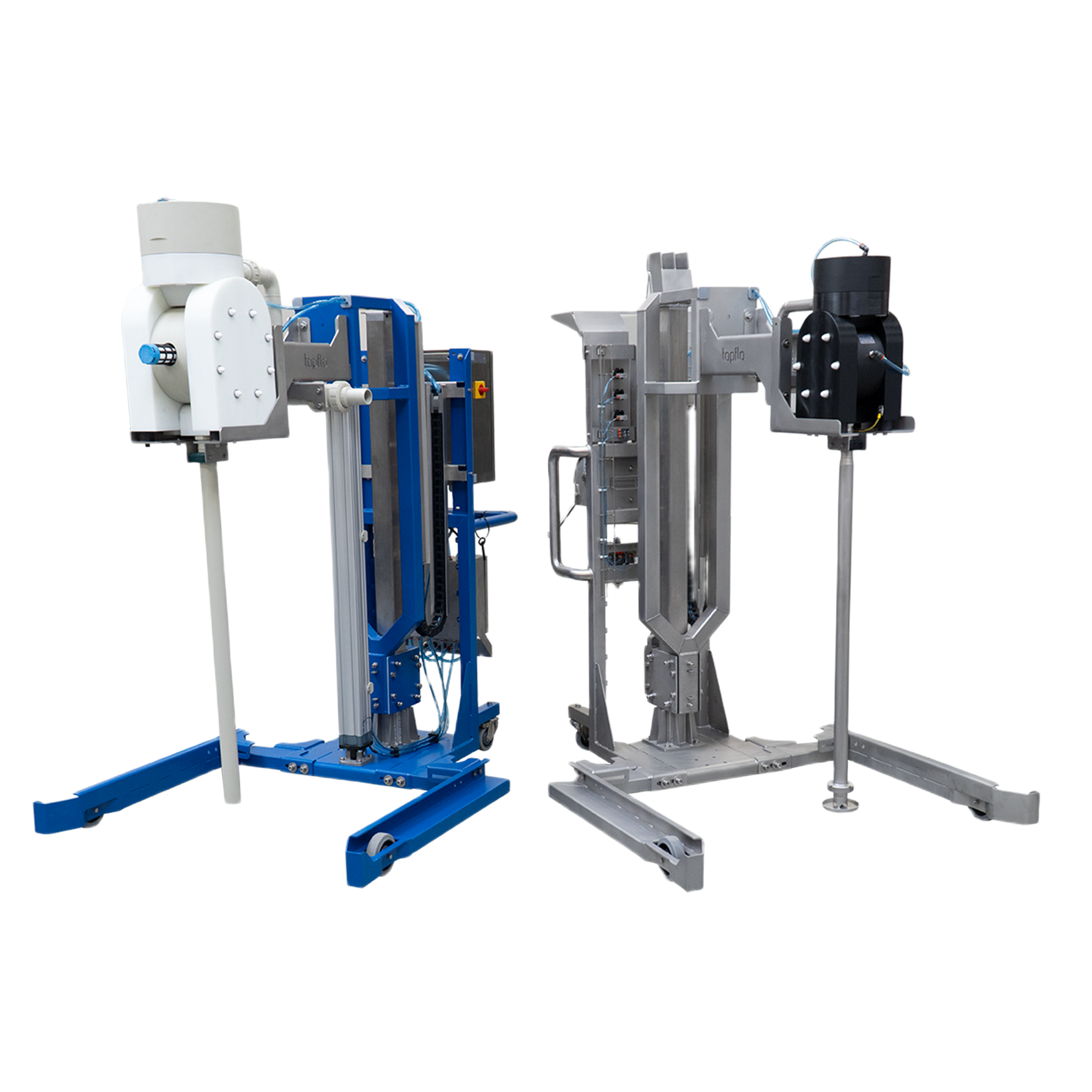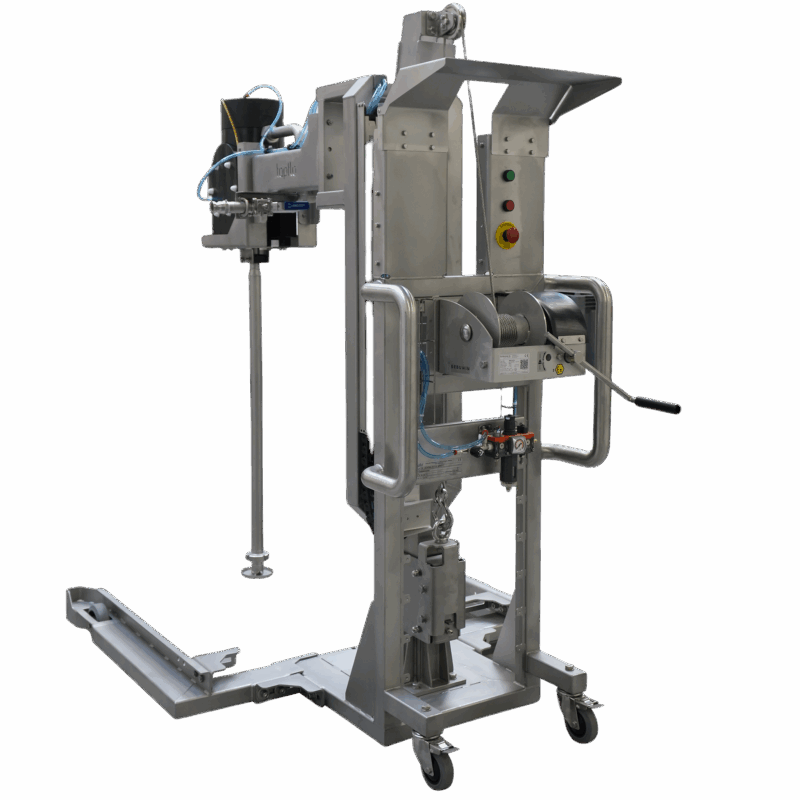 Aflæsningssystemet fungerer efter et enkelt og effektivt princip. Operatøren placerer enheden nær IBC’en, tanken eller tønden ved hjælp af den mobile ramme og placerer derefter beholderen under støttestrukturen med en gaffeltruck eller en pallevogn. Sugelansen sænkes til det ønskede niveau, og pumpeprocessen sættes i gang med et enkelt tryk på START-knappen.