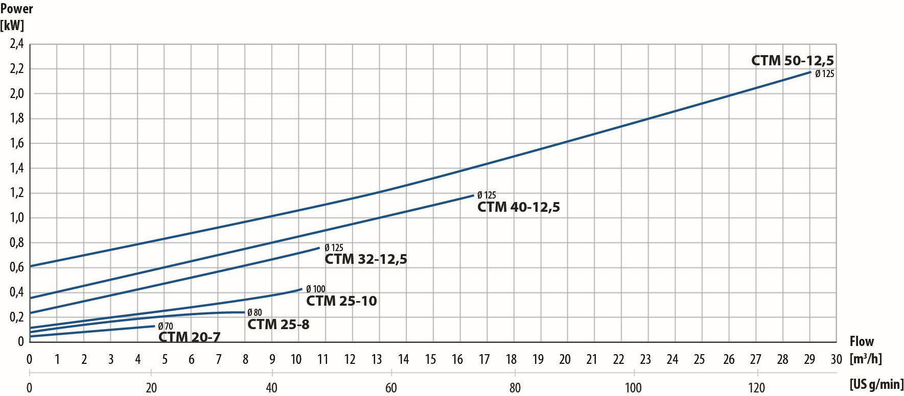 CTM20-7 har et halvåbent impeller, mens modellerne CTM25-8, CTM25-10, CTM32-12,5, CTM40-12,5 og CTM50-12,5 har lukkede impeller for at opnå de bedste pumpeparametre.