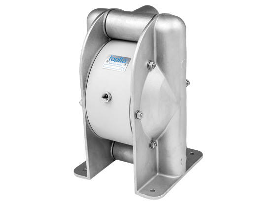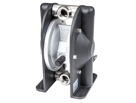 Tapflo membranpumpen drives af trykluft. To membraner arbejder skiftevis og suger mediet ind, henholdsvis skubber mediet ud i systemet. Kugleventiler fungerer som kontraventiler og leder væsken i den rigtige retning.