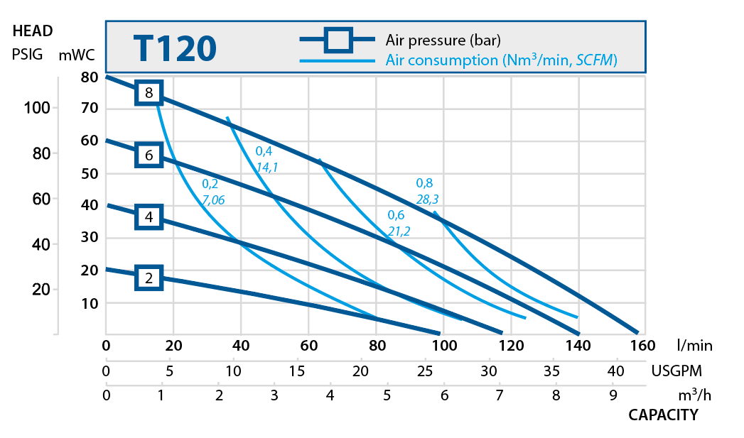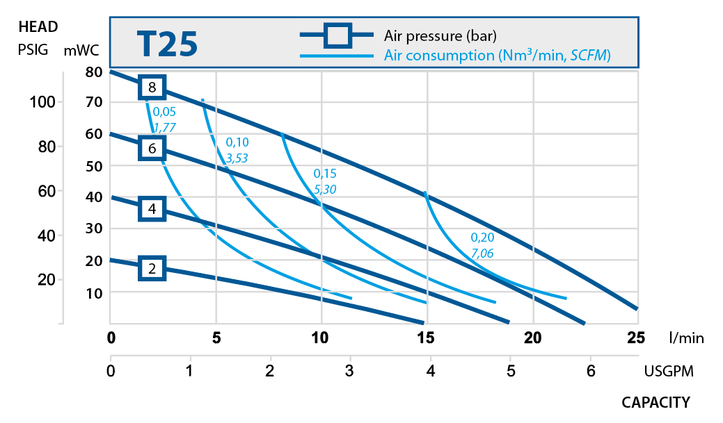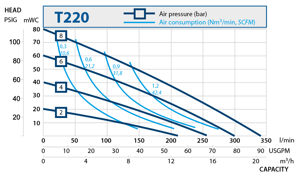 Under hver cyklus er lufttrykket bag udløbsmembranen lig med væskens løftehøjde på mediesiden. Det betyder, at Tapflo-membranpumper kan køre med en lukket udløbsventil uden at påvirke membranens levetid negativt.