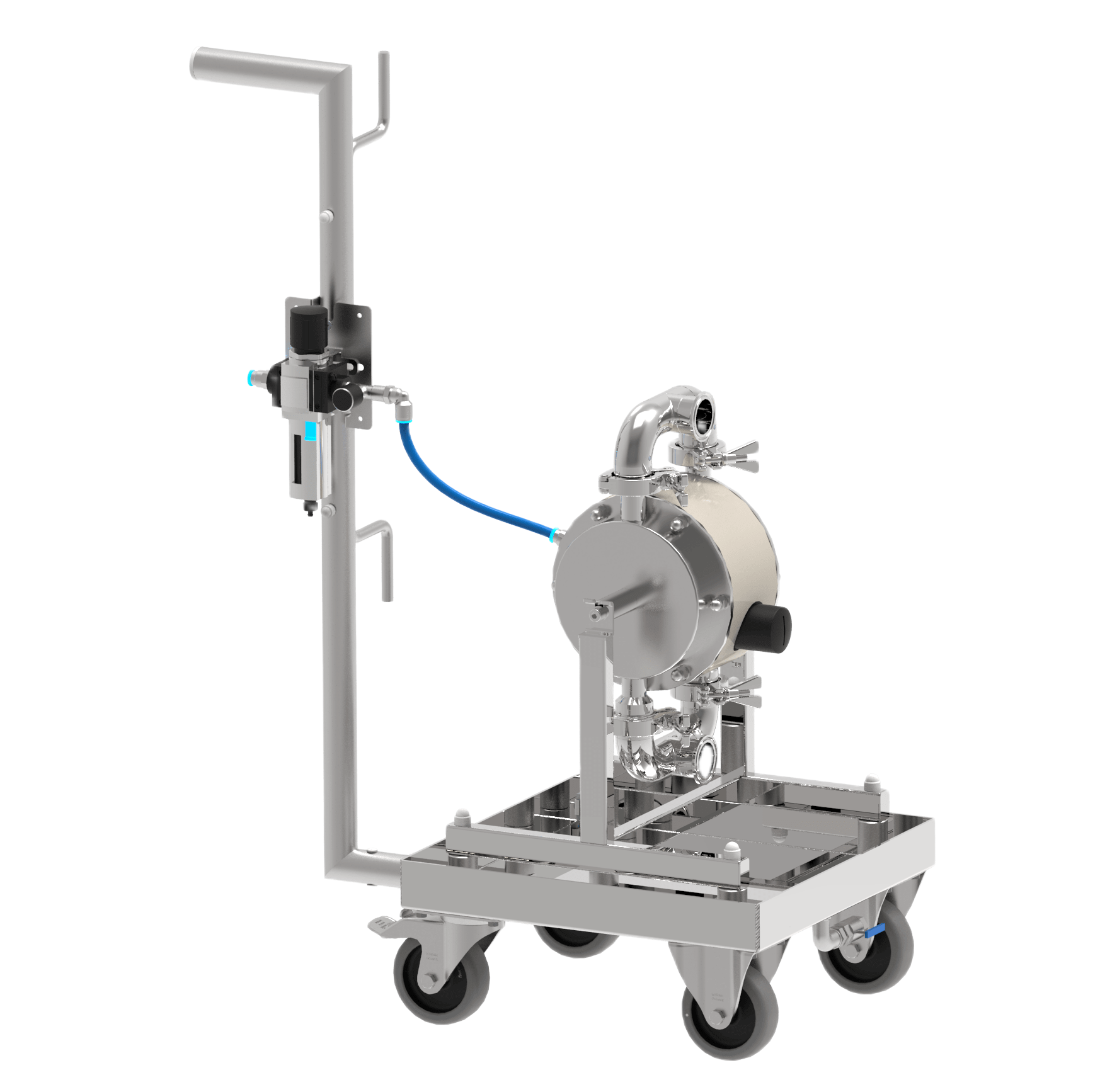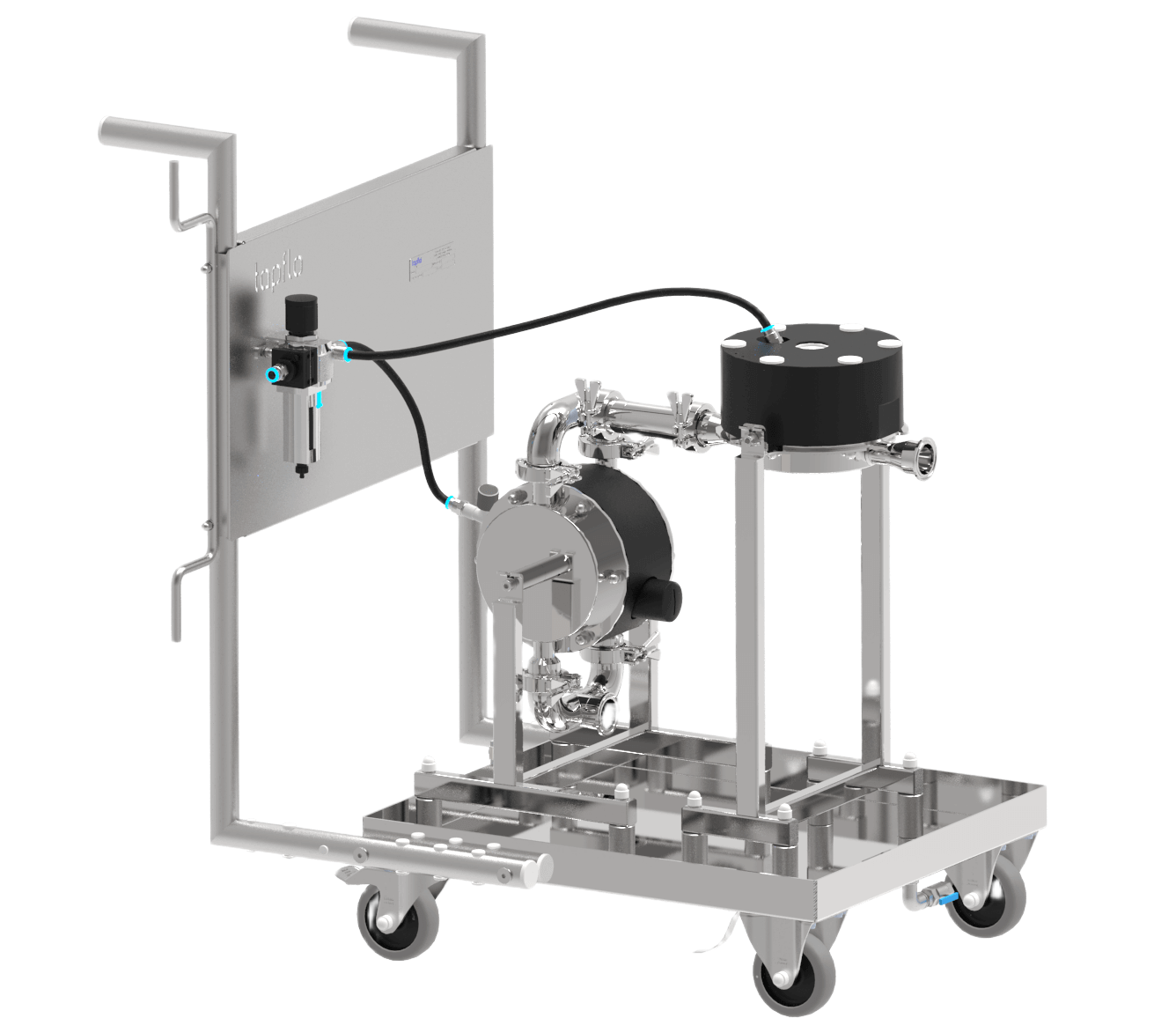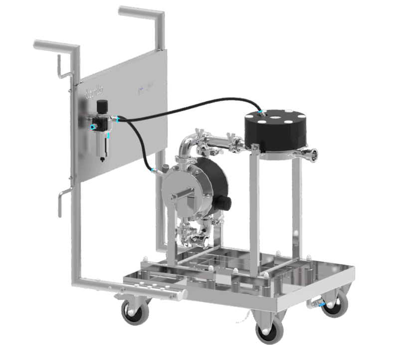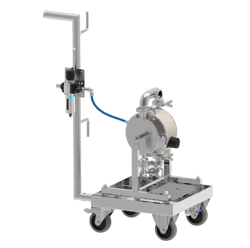 Mobile pumpeløsninger leveres i både hygiejniske og industielle versioner, begge med hver sine løsninger målrettet disse industriers krav og ønsker. Vognene er standardiserede, så de kan momteres med langt de fleste Tapflo pumper, og leveres med kort leveringstid. Vognene kan leveres med en lang rækkes “standard options”, som f.eks: luftbehandlingssæt, ON-OFF kontakt, frekvensomformer, kabel/slangeholder o.s.v.