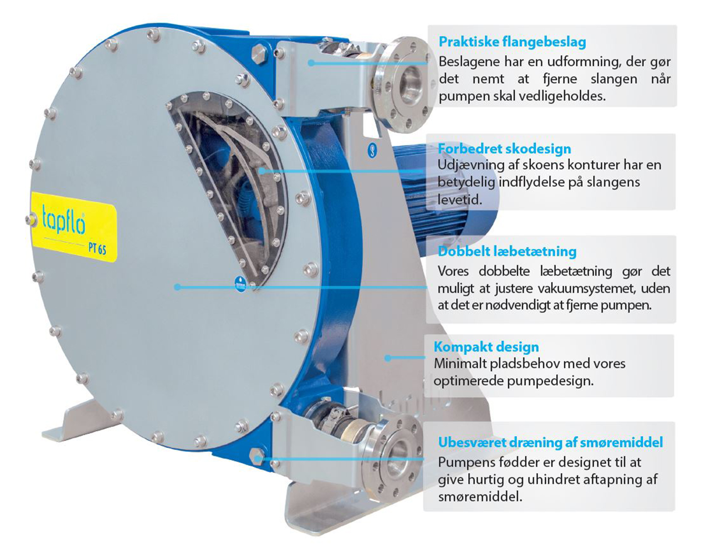 Tapflo PT-Serie slangepumper er heavy duty højtrykspumper til industrielle og hygiejniske anvendelser. Pumperne er designet til at være sikre, enkle og nemme at bruge og vedligeholde. Pumperne er velegnede til næsten alle forskellige væsker, der bruges i industrien i dag.