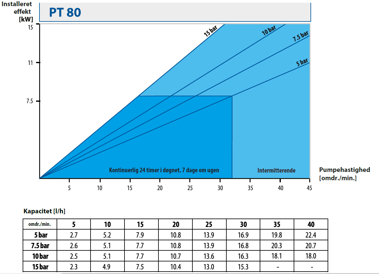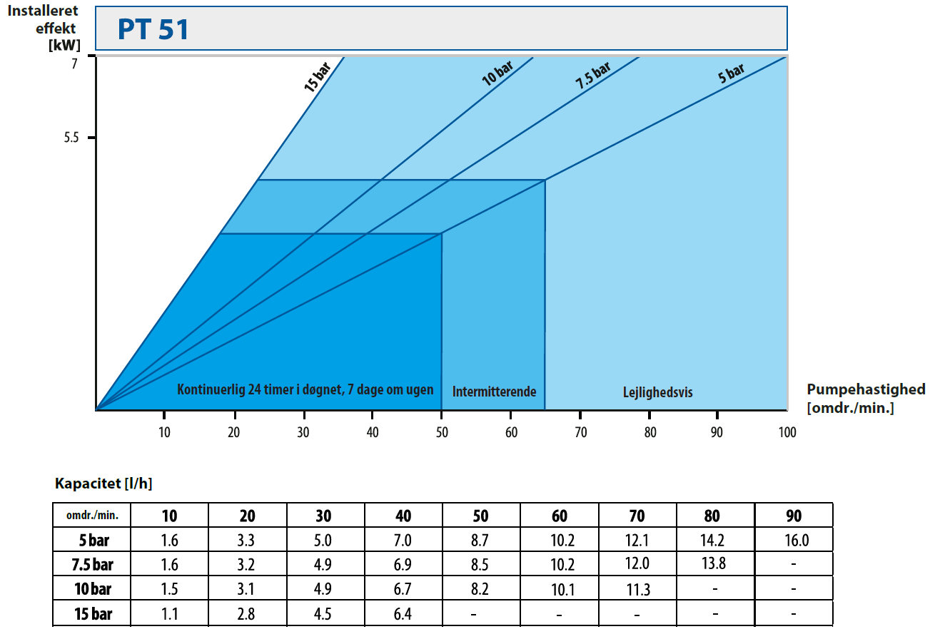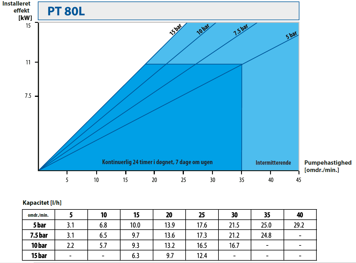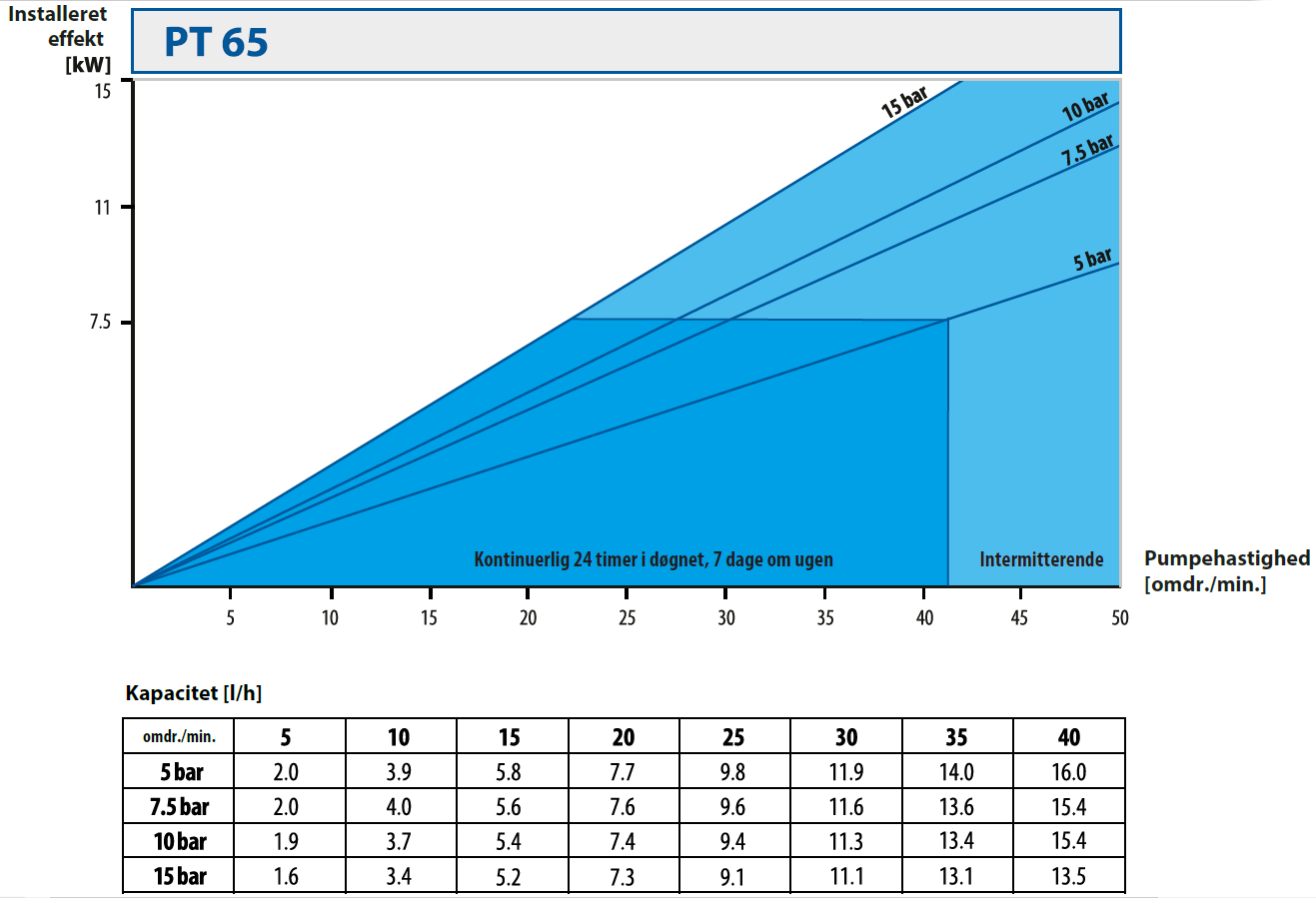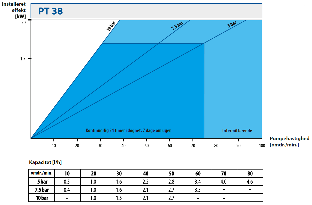 | Pumpestørrelse | Motoreffekt [kW] | Pumpehastighed [omdr./min.] |