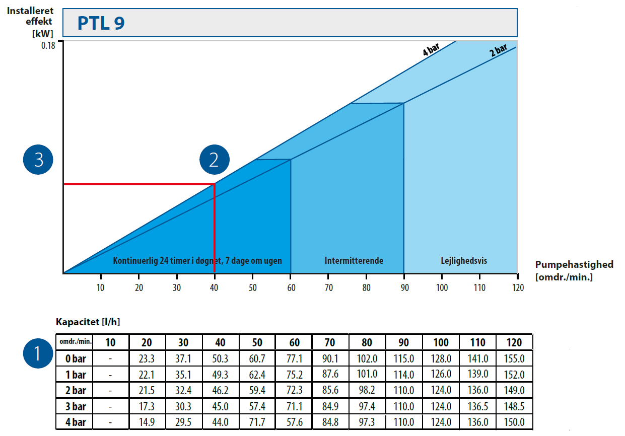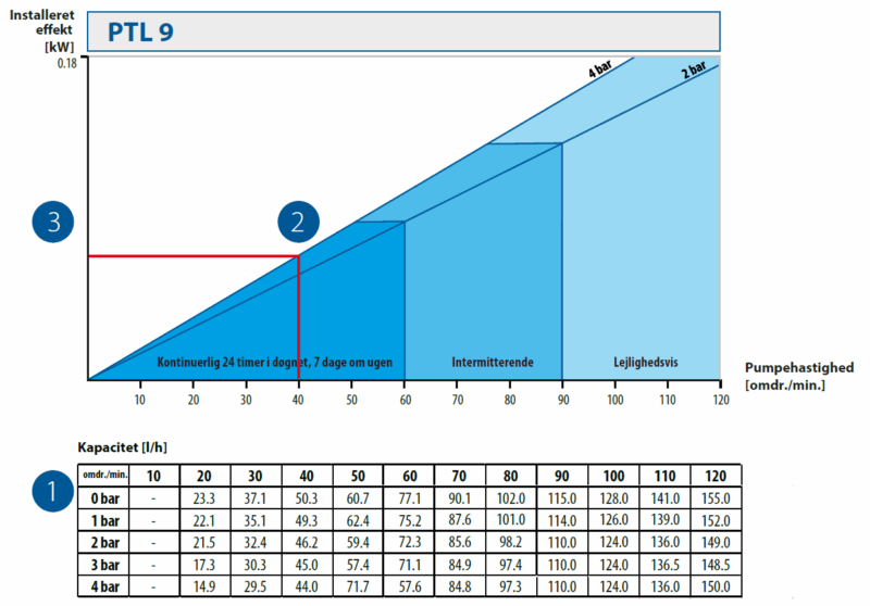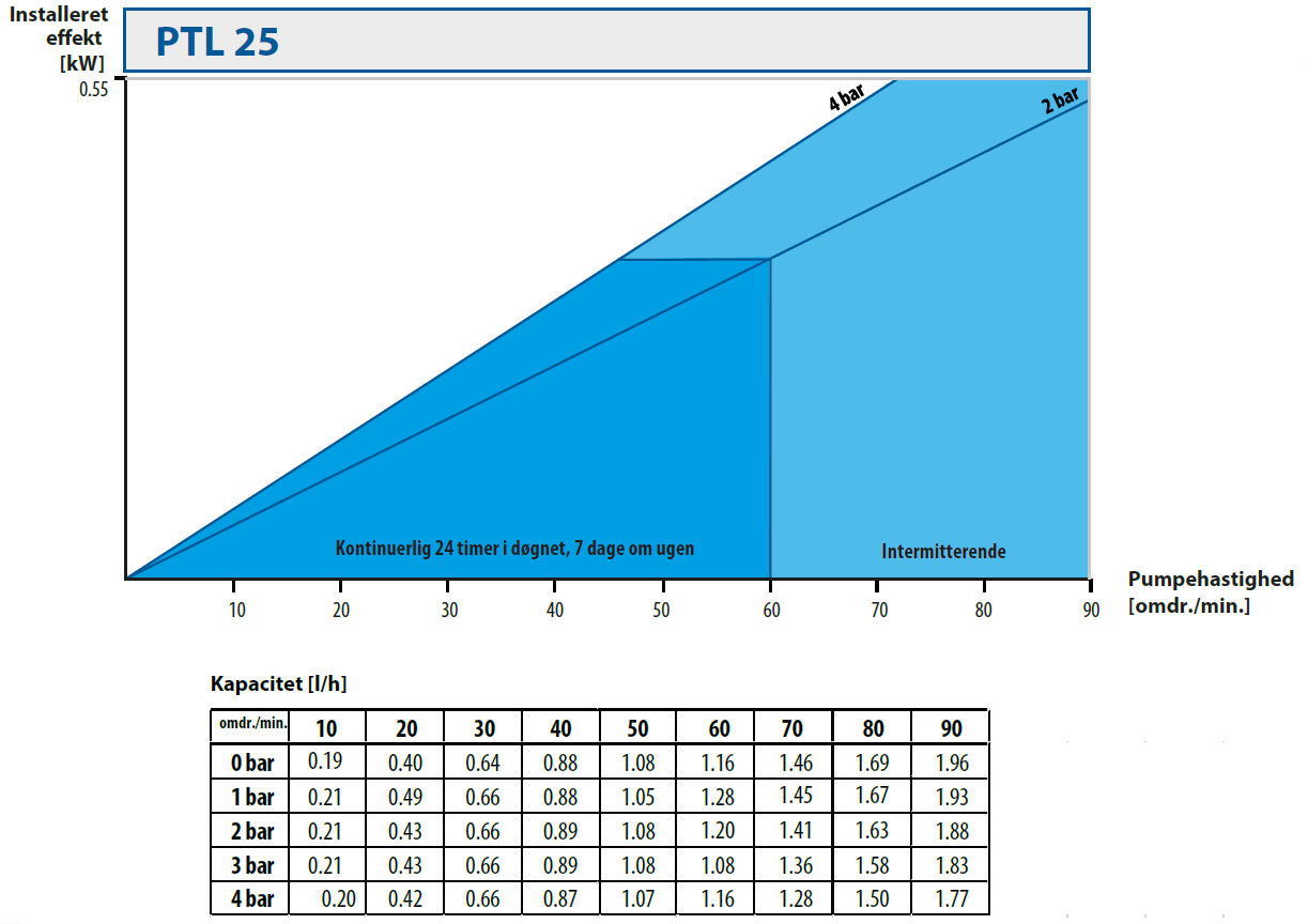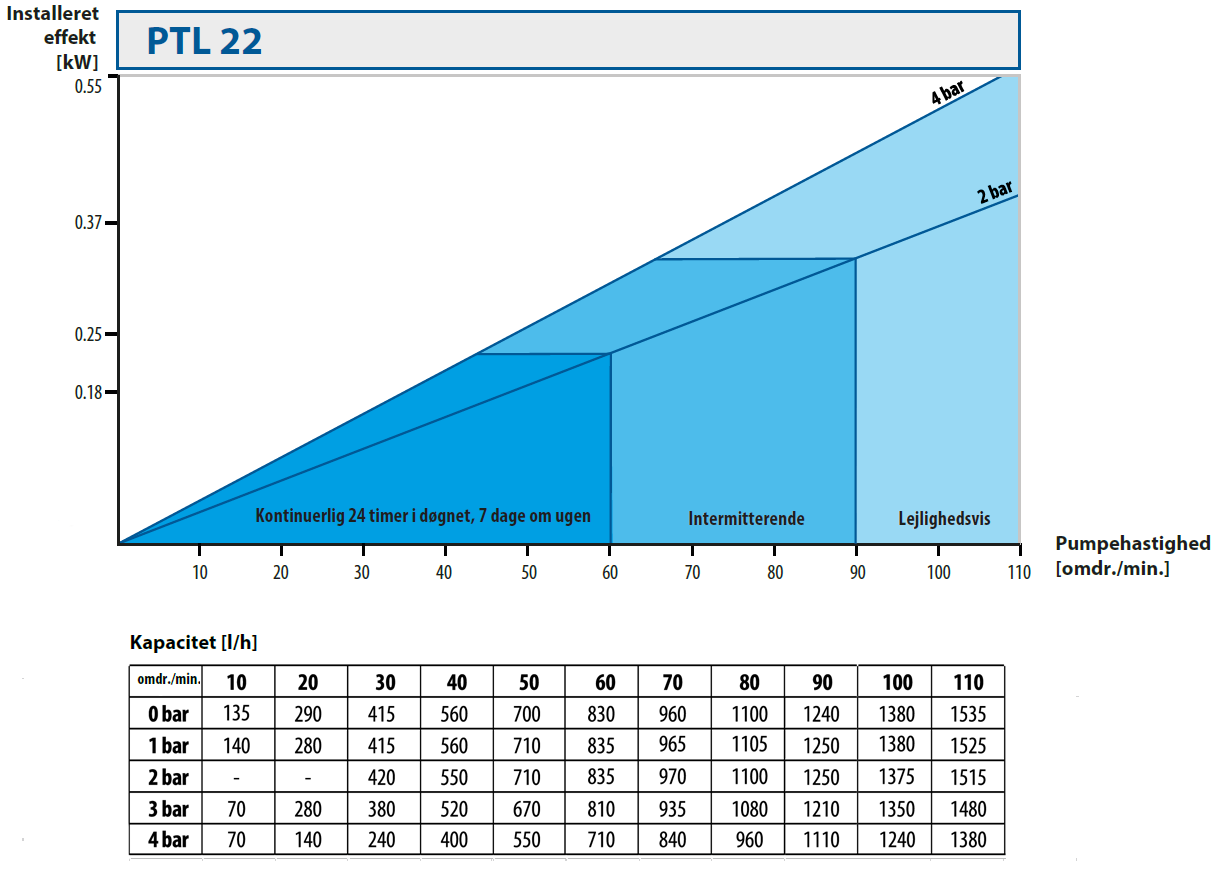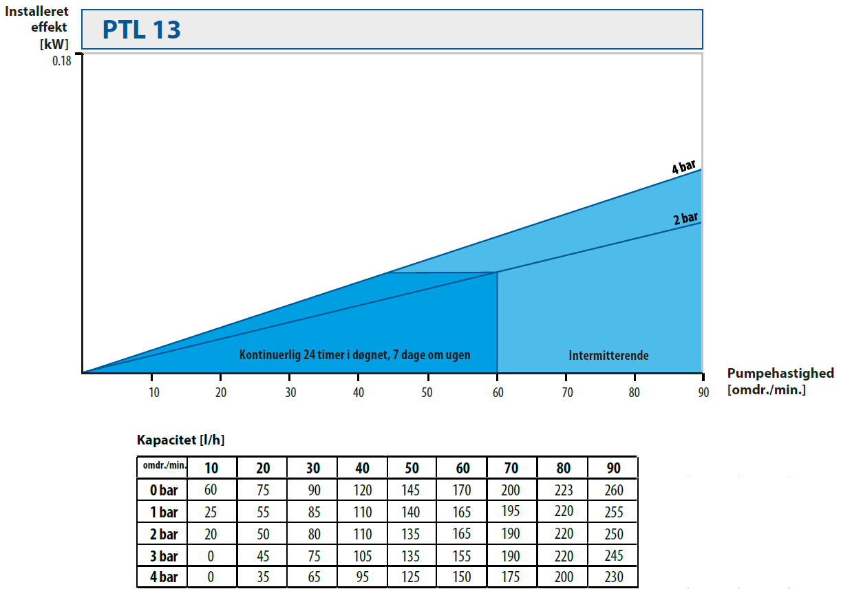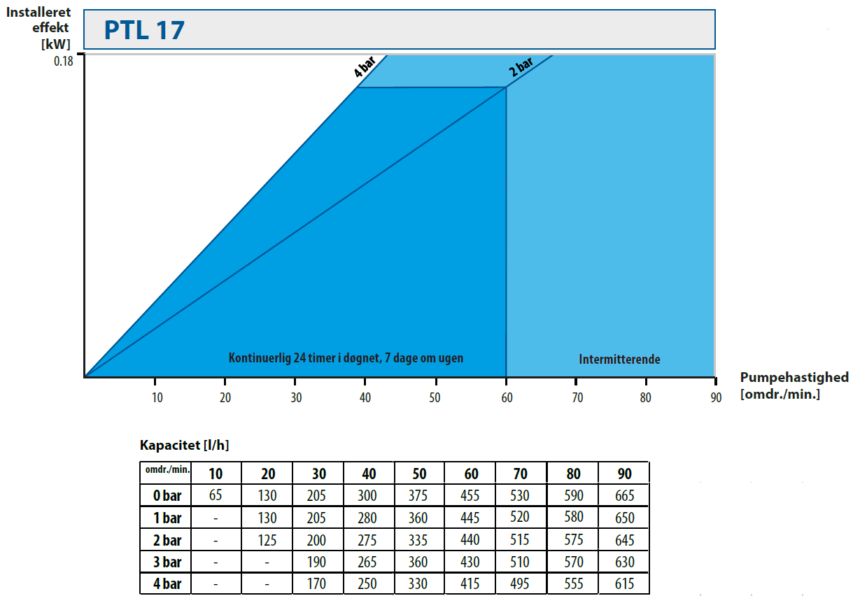 Pumper kan levere op til 4 bar i tryk, og har en stærk sugeevne. Den anvender ruller til at komprimere pumpeslangen, og der er ikke behov for kølemiddel i pumpen, som ved vores kraftigere PT-serie pumpe.
