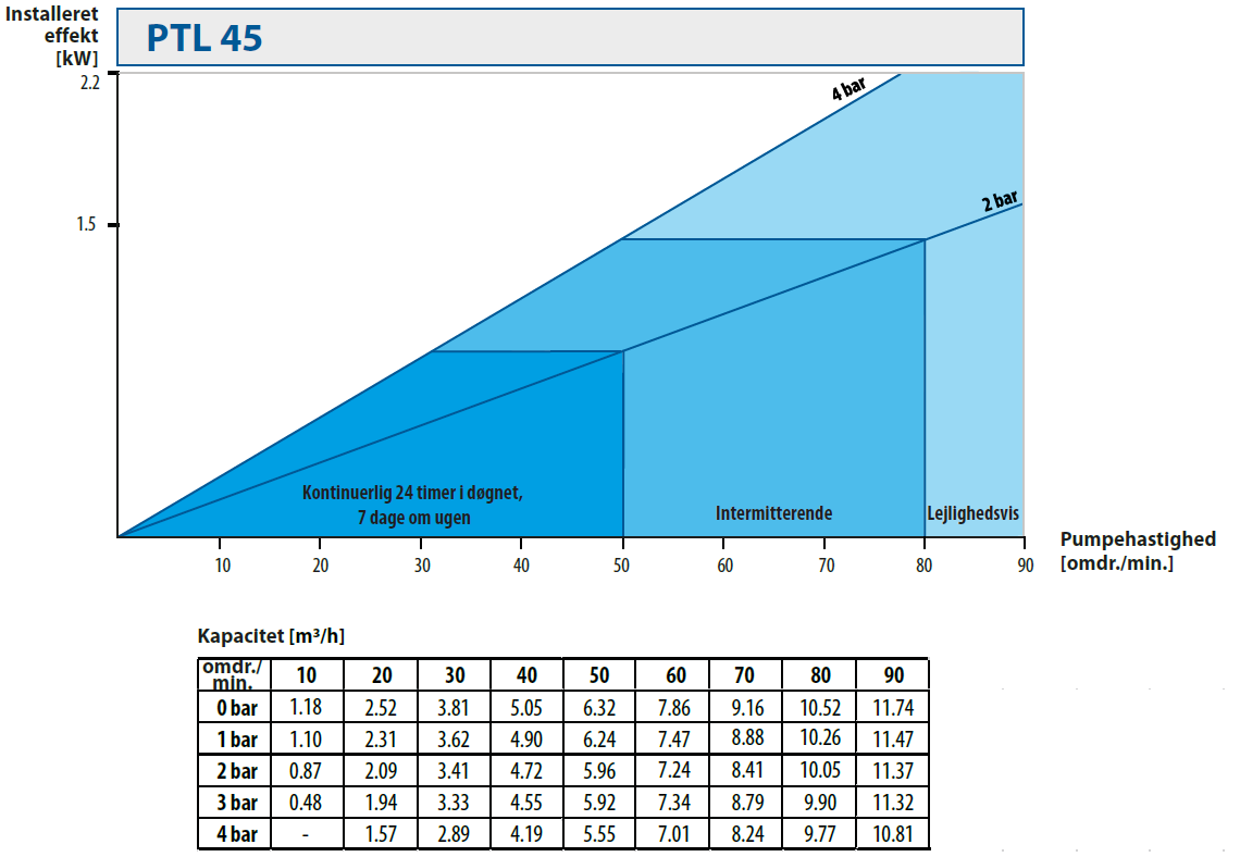 | Pumpestørrelse | Motoreffekt [kW] | Pumpehastighed [omdr./min.] |