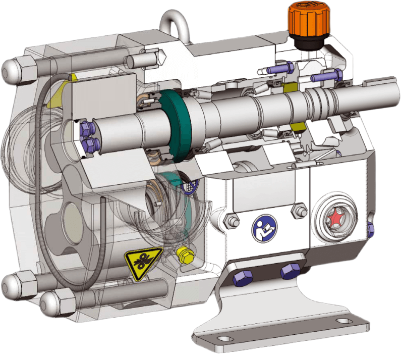 Når loberotorerne roterer, forøges volumen mellem loberne, hvilket skaber et undertryk på sugesiden (fig.1). Pga trykforskellen mellem lufttrykket over produktet og undertrykket i pumpen, skubbes produktet ind i pumpen (fig. 2 og fig. 3), over mod tryksiden (fig. 4). Her formindskes volumen mellem loberne igen, hvilket skaber et tryk som skånsomt presser produktet ud af pumpen.