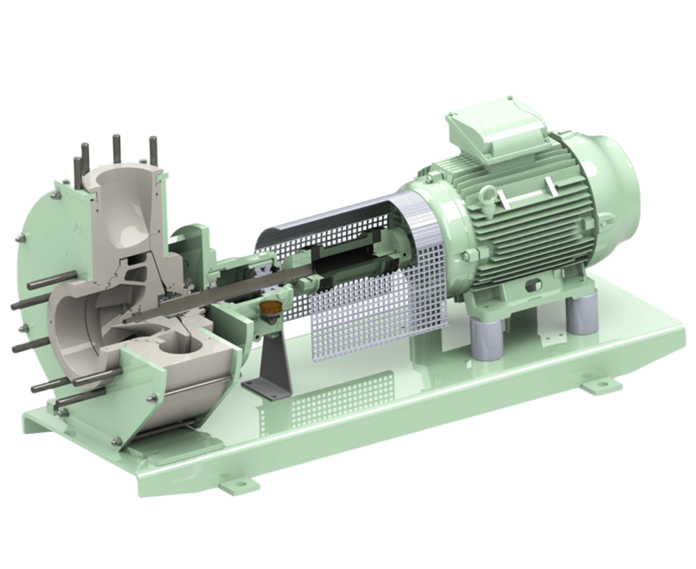Denne konfiguration består af en pumpe med såkaldt “fri akselende”, hvilket betyder at pumpen drives af en elmotor via en fleksibel kobling. Pumpe og motor er monteret på en bundplade af glasfiberforstærket polyester i henhold til DIN 24.259. Takket være enhedens “back pull out” design, kan pumpeenhedens hovedkomponenter fjernes, uden at selve pumpen eller pumpehuset, skal demonteres.