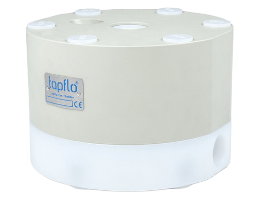 Tapflo DT-serie pulsationsdæmperen fungerer ved, at trykluften der også driver pumpen, automatisk indstiller sig til det tryk, der giver mindst mulige trykvariationer. Ved elektriske pumper, anvendes pulsationsdæmperen i “statisk mode”, hvor funktionen opnås ved at tilføre et fast lufttryk. Ved begge installationstyper er luftforbruget minimalt.