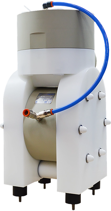 The dampener housing is also the manifold, so there is no need for additional connection of the dampener to the pump. This solution does not affect the media flow and significantly improves the damping effect, as the dampener is mounted in-line. The DTK version is designed to convert AODD and EODD pumps into pulsation-free pumps, after installation and connection to the compressed air source, replacing the standard outlet manifold. The diaphragm pump with built-in pulsation dampener compactly combines the advantages of our standard pumps with an active pulsation dampener: