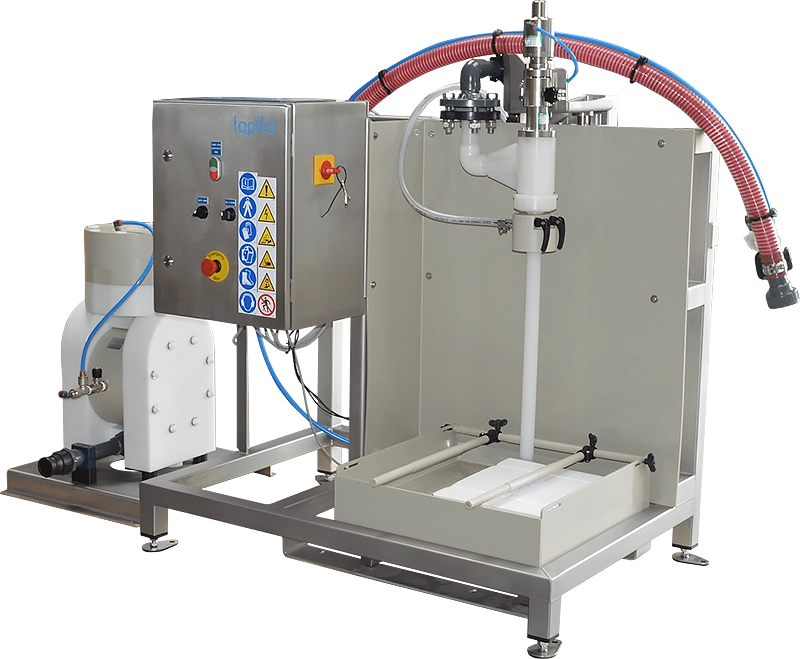 The Filling Machine System is highly customizable to meet your specific application needs. You can choose from different pump types — such as diaphragm pumps, lobe pumps, centrifugal pumps, gear pumps, or peristaltic pumps — depending on the product’s viscosity, shear sensitivity, and other characteristics. Components in contact with the medium are made of stainless steel AISI 316 or specialized plastics such as polypropylene for aggressive media. For applications involving such media, the system includes a plastic drip tray for added safety and convenience. Weight scales come in a variety of sizes, offering flexibility to accommodate different container dimensions.