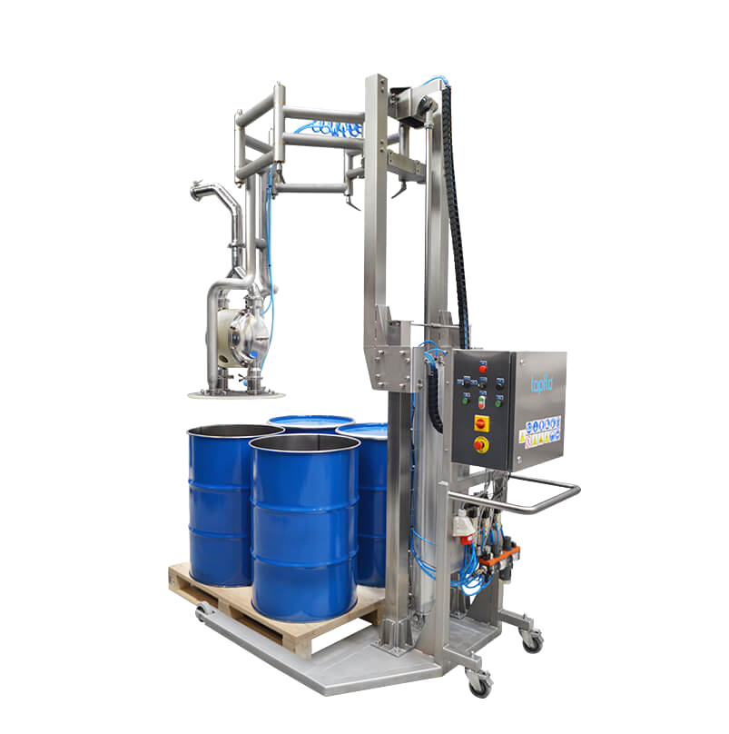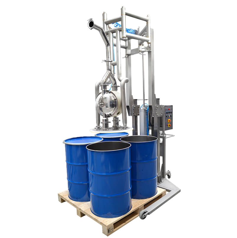 Our HVS Quattro drum unloading solution incorporates a sanitary double diaphragm pump with built-in lifting and lowering functions, designed for the swift and efficient unloading of 200-liter drums. This mobile system ensures the rapid extraction of contents, such as double-concentrated tomato paste, from a drum in less than two minutes, highlighting its exceptional speed and effectiveness in real-world applications.