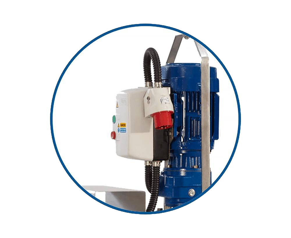 The next step is to connect the power supply to the mixer drive. Depending on the selected drive type, this will be electric power (1- or 3-phase) or pneumatic power (compressed air).