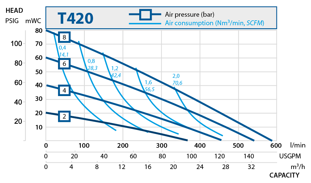 During each cycle, the air pressure behind the discharge diaphragm is equal to the liquid lift height on the medium side. This means that Tapflo diaphragm pumps can operate with a closed discharge valve without negatively impacting diaphragm life.