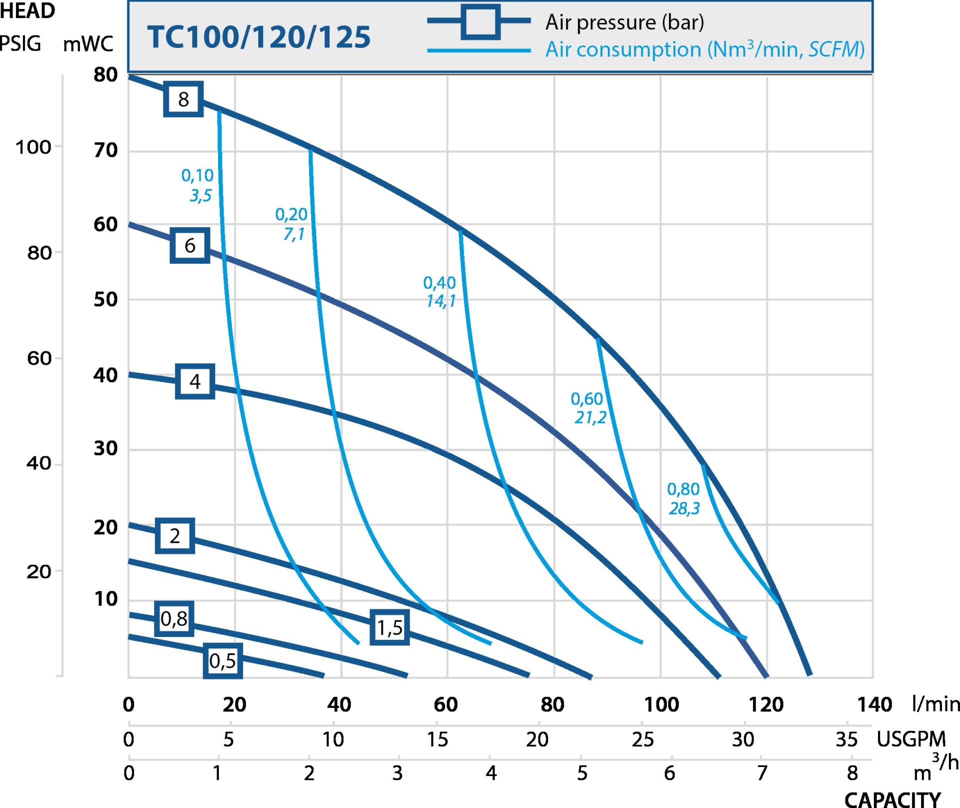 * = Recommended flow is half of the max flow, i.e. recommended flow for a TC125 is 60 l/min (15.9 US gpm).