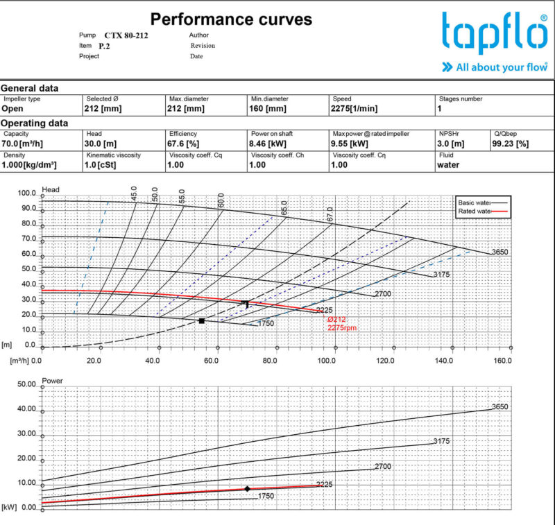 Le curve di prestazione (o caratteristiche) delle pompe centrifughe illustrano la relazione tra portata (Q), prevalenza (H), potenza all’albero (P), rendimento (η) e prevalenza netta positiva di aspirazione richiesta (NPSHr), tipicamente a velocità costante o entro specifici intervalli di velocità. Ogni dimensione di pompa all’interno di una data serie copre un intervallo QH definito tramite la rifilatura della girante, massimizzando la copertura QH totale dell’intera serie. Tuttavia, a causa dei crescenti costi energetici e del fatto che le pompe raggiungono solitamente la loro massima efficienza al diametro massimo della girante, la selezione delle pompe centrifughe basata sulle curve QHP a velocità variabili (tramite controllo di velocità anziché rifilatura della girante) sta diventando sempre più comune.