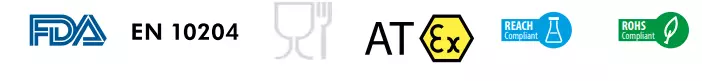 Gli smorzatori di pulsazioni Tapflo della serie igienica sono utilizzati in molti settori dell’industria alimentare, cosmetica e farmaceutica. Naturalmente, rispettiamo tutti gli standard europei e internazionali richiesti, come EN 10204, FDA, EC 1935/2004, EC10/2011 e USP VI.