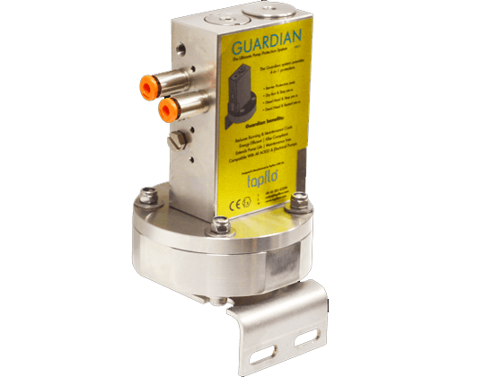 Il Guardian controlla la pressione di mandata del fluido della pompa, fermandola se la pressione sale oltre il punto di lavoro, a causa di una valvola chiusa o di una sovrapressione nella linea. Quando la pressione scende al di sotto della pressione impostata, la pompa si riavvia automaticamente.