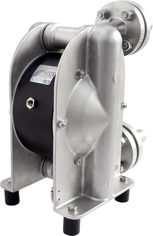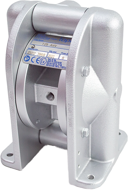 Tutte le pompe in metallo sono disponibili in versione ATEX. Sono provviste messa a terra e prodotte con materiali conduttivi: il blocco centrale è conduttivo (sulle pompe AISI 316), membrane in PTFE (conduttive sul retro) o in EPDM (conduttivo)