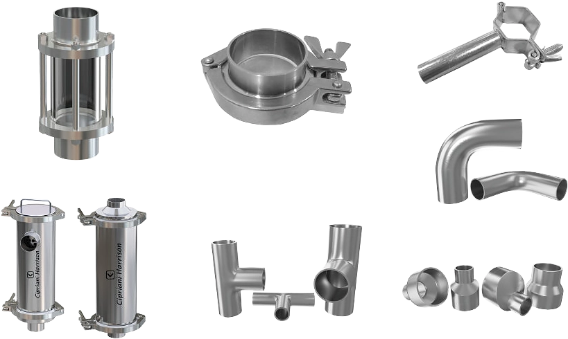 Offriamo componenti per tubazioni di alta qualità progettati da esperti Cipriani Harrison per sistemi di tubazioni igienici e industriali. Questa gamma completa comprende componenti prefabbricati e lavorati a macchina come gomiti, tee, riduttori, raccordi sanitari, spie, filtri, filtri a cestello e connessioni asettiche, tutti fabbricati secondo rigorosi standard igienici, incluse le certificazioni ASME BPE e 3A.