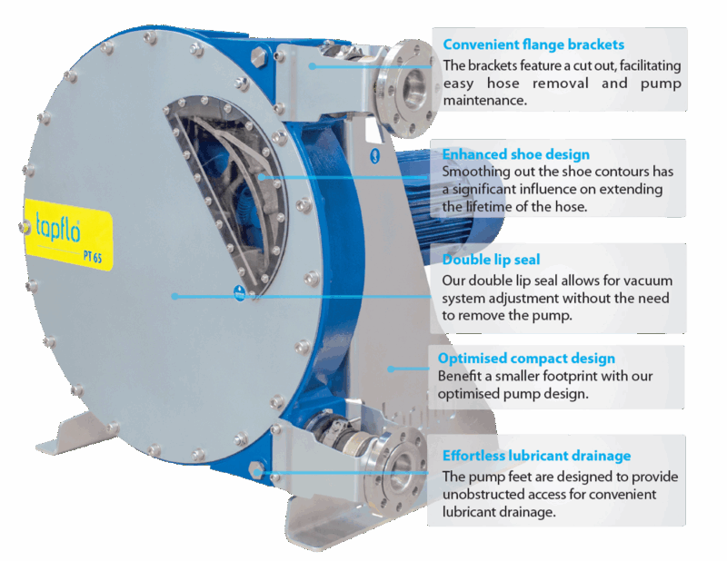 De Tapflo slangpomp wordt aangedreven door een tandwielmotor. De rotor is direct op de as gemonteerd. Hij is uitgerust met schoenen of heeft zelf een speciale vorm. De schoenen drukken de slang samen, waardoor er een vacuüm ontstaat aan de zuigzijde van de pomp en druk aan de afvoerzijde om de vloeistof te transporteren. De roterende beweging van de schoenen comprimeert de slang langs de wand van de behuizing, waarbij de vloeistof constant door de slang wordt gezogen/geduwd. De stroming is omkeerbaar, aangezien de pomprichting afhankelijk is van de draairichting van de motor. De pomphuizing is gevuld met smeermiddel om de wrijving tussen de slang en de schoenen te verminderen. De slang en de pomp inzetstukken (aansluitingen) zijn de enige onderdelen van de pomp die in contact komen met de te pompen vloeistof.