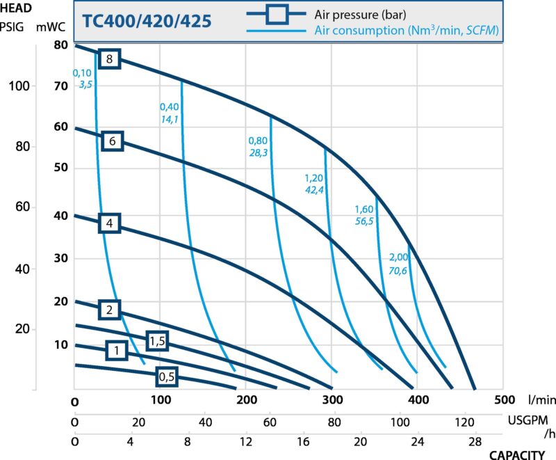 | * = Aanbevolen debiet is de helft van het maximale debiet, d.w.z. aanbevolen debiet voor een TC125 is 60 l/min (15,9 US gpm). ** = De waarde is gebaseerd op pompen met EPDM-membranen. Pompen met PTFE-membranen hebben ongeveer 15% minder volume. *** = Dit is de maximale waarde met klepballen van roestvrij staal, andere klepbalmaterialen kunnen de zuiging verminderen. Neem contact met ons op. |