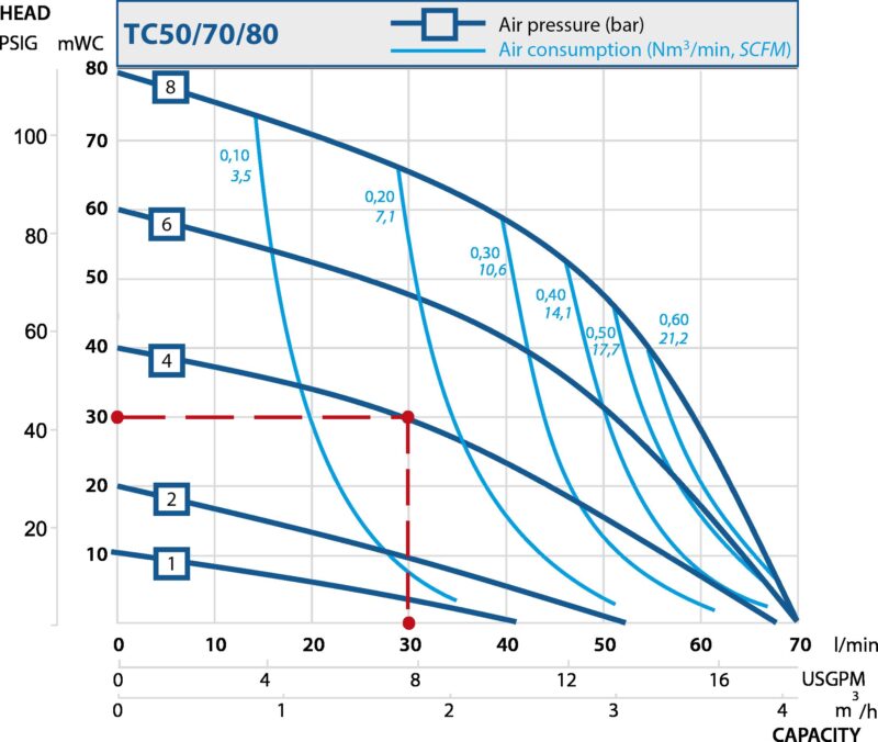 Onder standaardomstandigheden draait de pomp met één luchttoevoer vanaf 0,3 bar, waarbij de luchttoevoer naar de regelmodule wordt verkregen uit de interne pilot – hoofd-luchttoevoer.