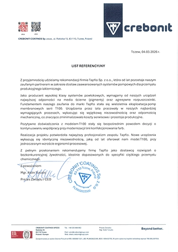 Klient potwierdził, że nowe urządzenia wykazują się taką samą niezawodnością, jaką charakteryzowały się wcześniej użytkowane modele Tapflo T100 PTT. Ostatecznie Grupa Crebonit zyskała system o wyjątkowej żywotności komponentów, który skutecznie radzi sobie z wymagającymi mediami ściernymi, gwarantując powtarzalność i bezpieczeństwo procesowe na najwyższym poziomie.