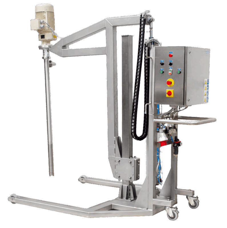 Med kontrollpanelen kan du enkelt växla mellan automatiskt och manuellt driftläge. Den gör att du enkelt kan justera pumpens position (HÖJ eller SÄNK) och hantera driften (START eller STOPP). Dessutom har du kontroll över flödeshastighet och aktivering av tryckluft mellan locket och fatet. Varje kontrollpanel är utrustad med en huvudströmbrytare (PÅ/AV) och en knapp för nödstopp för ökad säkerhet.