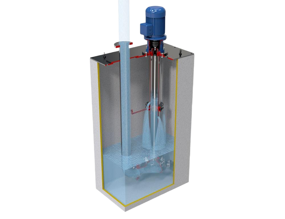 Vertikal nedsänkbar centrifugalpump byggd enligt ISO 5199-norm. Linjeaxel med lagerbussningar.
