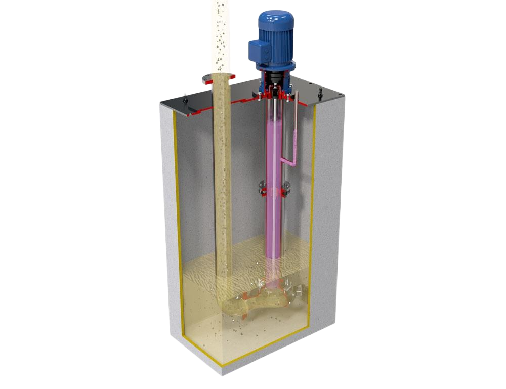 För aggressiva vätskor som innehåller fasta ämnen. En mekanisk tätning är placerad mellan axeln och höljet för att fylla rörkolonnen. Alla lagerbussningar (botten och mellanliggande) smörjs med spolvätska. |