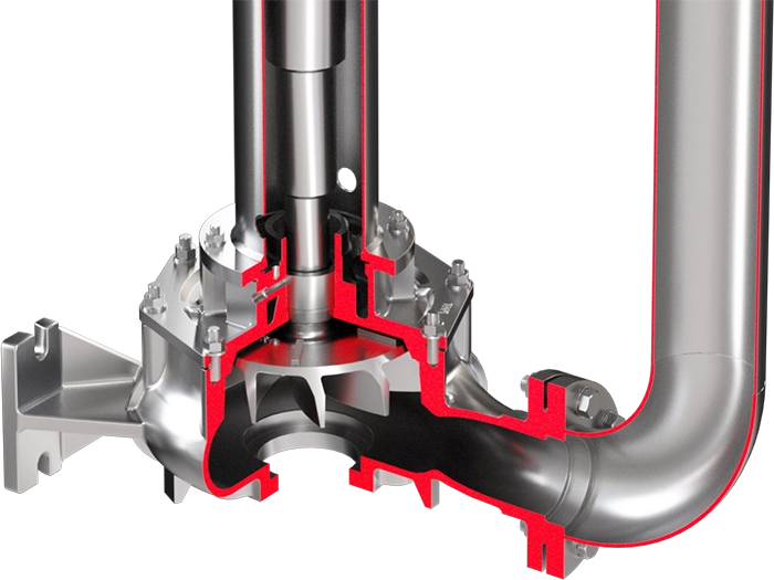 The Cantilever series vertical pump is a vertical pump with a non-clogging recessed impeller (RBC), vortex (RCC) or closed (RDC) impeller. The pump casing is submerged in the liquid, and the motor is mounted above the mounting plate, outside the medium area. The oversized ball bearing with a lubricator located above the mounting plate is not exposed to the corrosive environment. This means that no bearing is located in the liquid, there is no seal or bearing housing, and the bearing assembly is sealed to prevent contamination by liquids or gases and vapors.