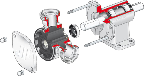 Industrial flexible impeller pump for standard and hygienic applications. The primary advantage of a flexible impeller pump is its self-priming capability. As the vanes of the impeller are depressed and rebound, they create their own vacuum drawing fluidinto the pump.