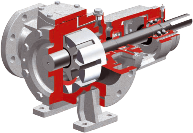 The rotor and pinion rotate and mesh with each other. This creates sealed chambers with variable volume, resulting in a vacuum that forces the medium to flow into these spaces. The liquid is transported in the chambers from the suction side to the discharge side. The spaces are separated from each other by an element that prevents the liquid from returning to the suction side. The medium is pumped to the discharge side as a result of the reduction in the volume of the interdental spaces.