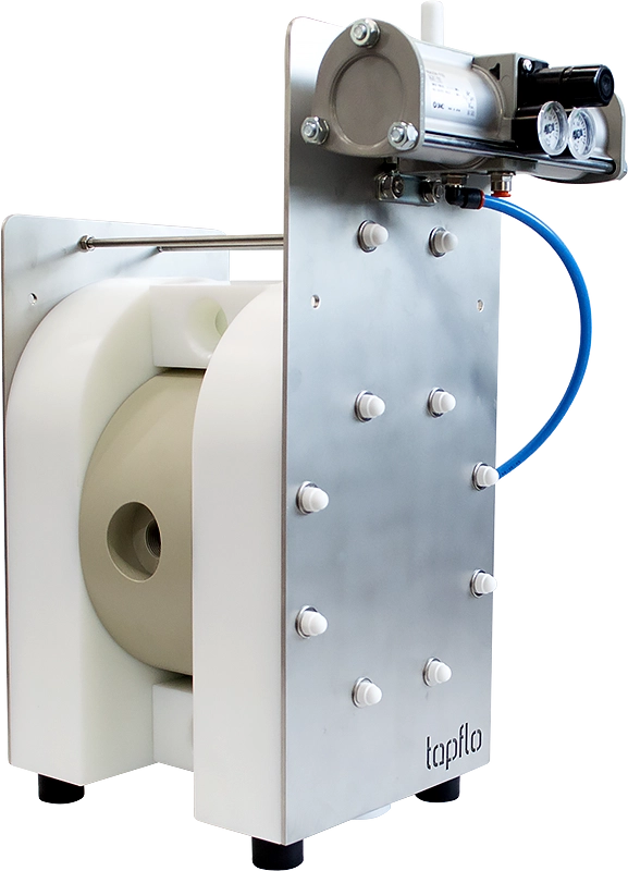The TF series high-pressure pumps are based on standard Tapflo diaphragm pumps – available in PE/PTFE and metallic versions. When purchased as a complete unit, the pressure regulator and pressure booster are already installed on the pump by means of an external mounting bracket.