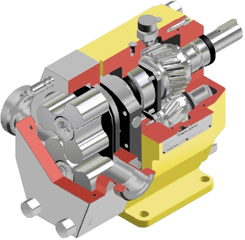 The operating principle of a lobe pump is based on displacing a specific dose of liquid from the suction area to the discharge area by rotating the working elements (lobes). The lobes are mounted on shafts, which are supported by bearings in an external synchronizer. Shafts equipped with gears, located inside the synchronizer, transfer the drive from the drive shaft to the intermediate shaft. The lobes are synchronized so that they do not touch each other during operation.