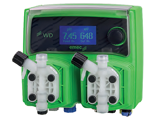 | WDPHxx series The WDPHxx system, which integrates a controller with proportional dosing pumps, is the solution for specific needs such as those in the swimming pool sector. It features an LCD display, encoder knob, PVDF pump body and hydraulic parts, stand-by, flow control input, delayed dosing start, pH dosing priority setting, service menu with instantaneous probe value, probe check-up and alarms. The RS485 output allows remote management via web using the exclusive ERMES system. |